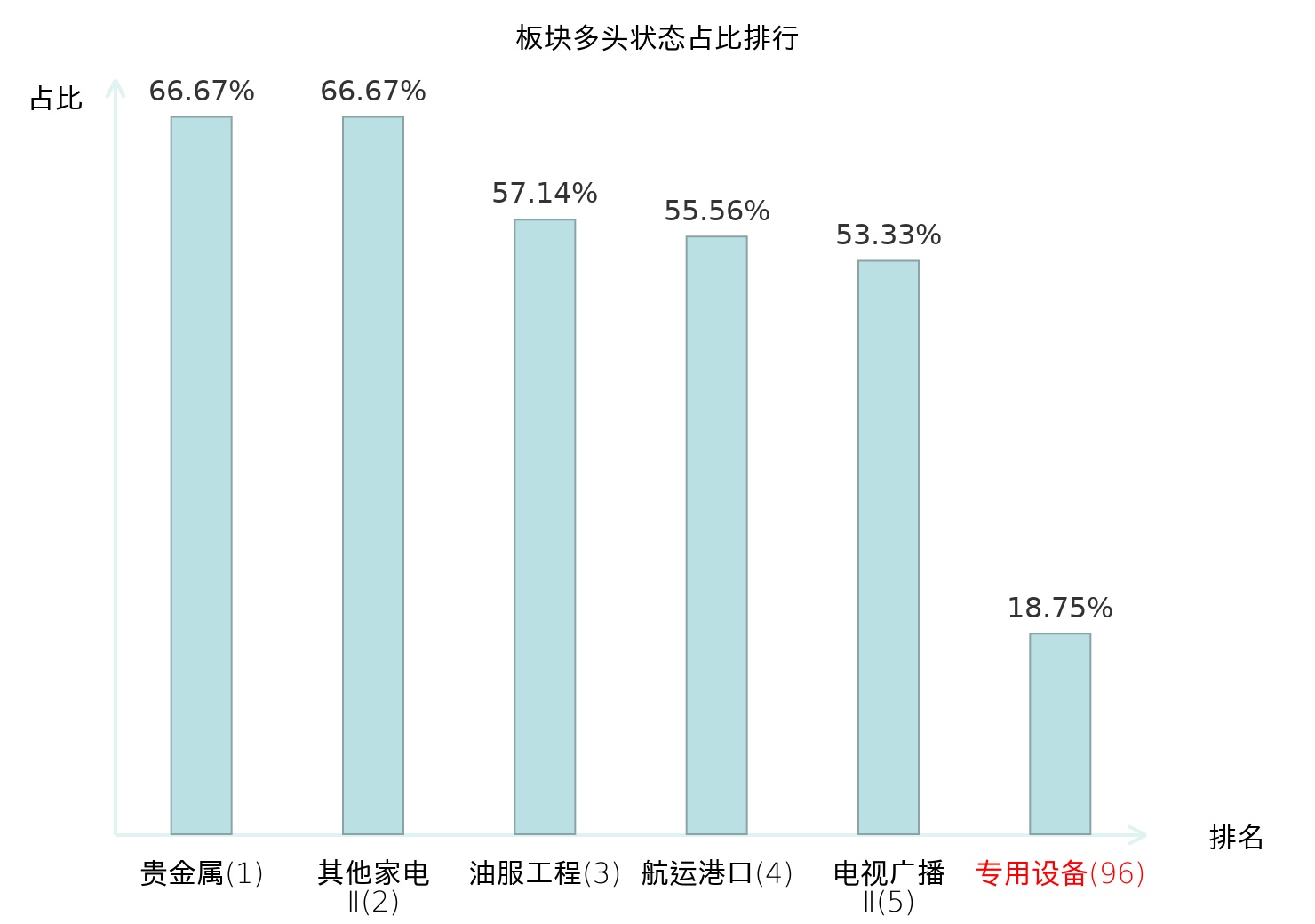 全市场所有行业板块中主力多头状态占比排名中,贵金属板块位居第一。医疗服务板块名次提升最快,较昨日上升68位。