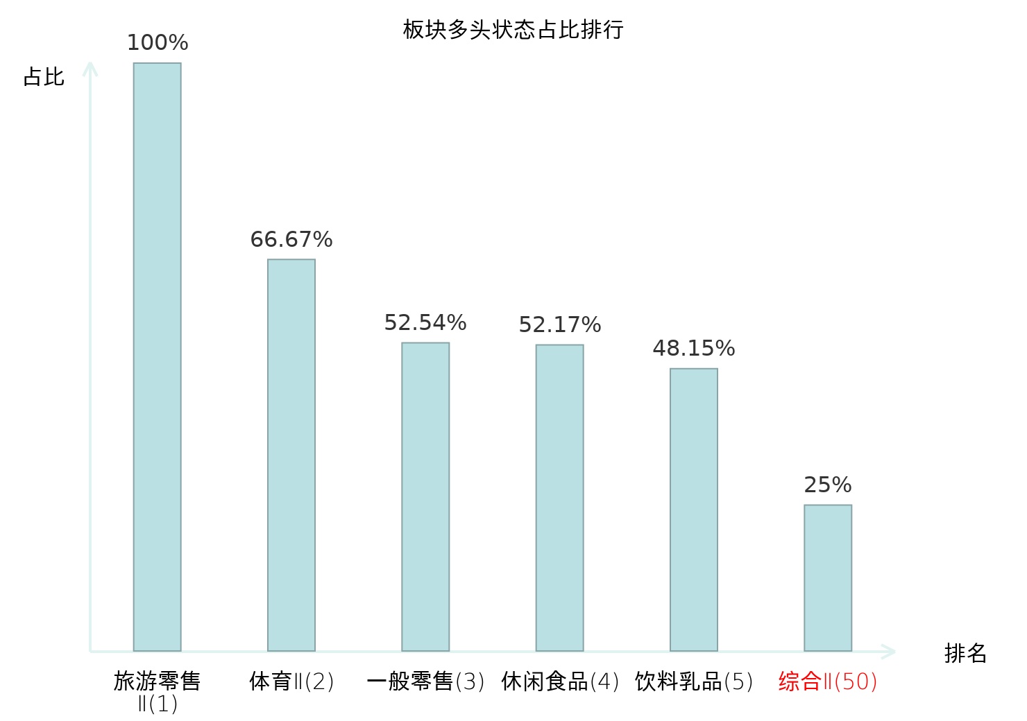 全市场所有行业板块中主力多头状态占比排名中,旅游零售Ⅱ板块位居第一。农业综合Ⅱ板块名次提升最快,较昨日上升109位。