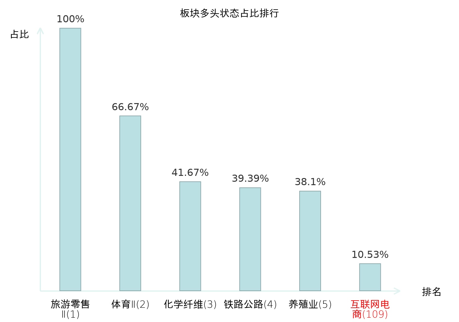 全市场所有行业板块中主力多头状态占比排名中,旅游零售Ⅱ板块位居第一。旅游零售Ⅱ板块名次提升最快,较昨日上升130位。