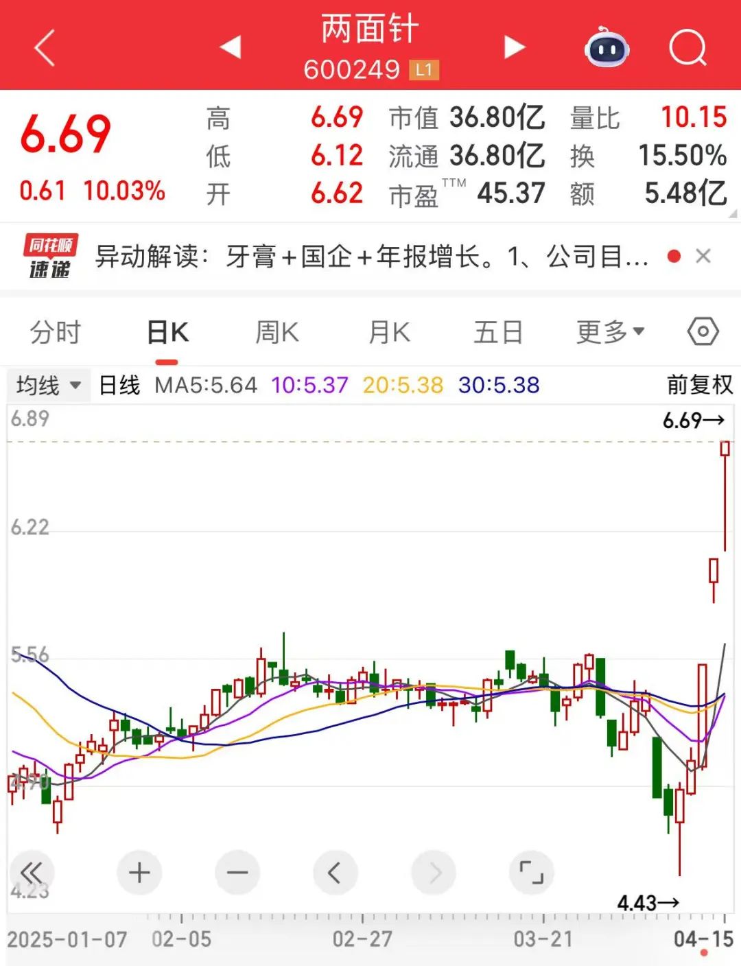 4月15日早盘,两面针(600249.SH)大幅高开,短暂调整后又迅速封住涨停板,涨停板封单一度超过27万手。此前2个交易日,该股均录得“10cm”的涨停板;至此,该股已连续收获3个涨停板。