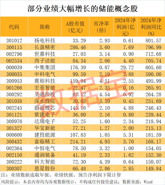 据证券时报·数据宝统计,根据已经披露的年报、业绩快报、预告净利润下限(若无下限则取公告数值)计算,2024年净利润同比增长20%(含扭亏为盈)的储能概念股有95只。扬电科技长盈精密西子洁能中集集团中科电气等净利润增速靠前。