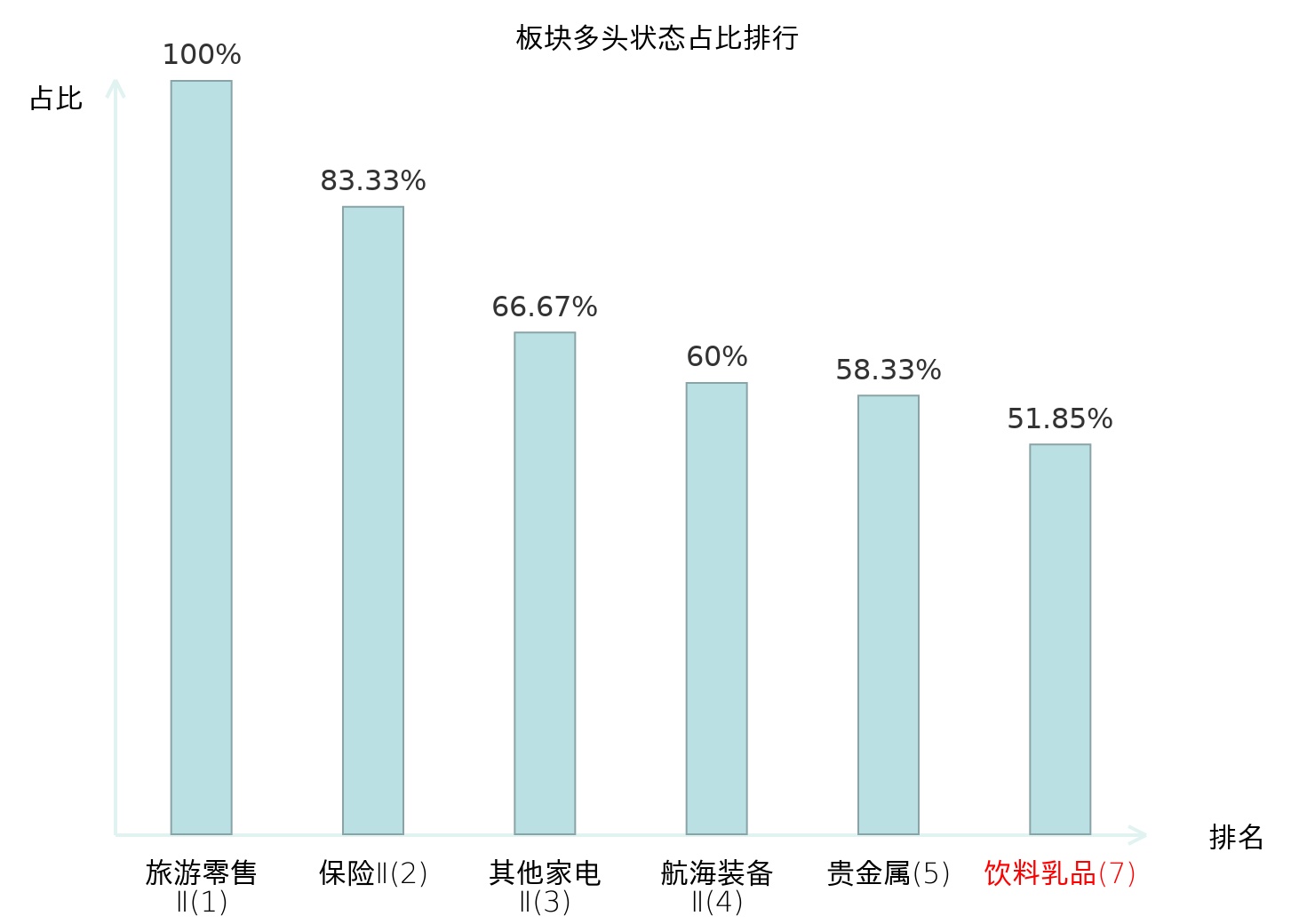 全市场所有行业板块中主力多头状态占比排名中,旅游零售Ⅱ板块位居第一。综合Ⅱ板块名次提升最快,较昨日上升69位。