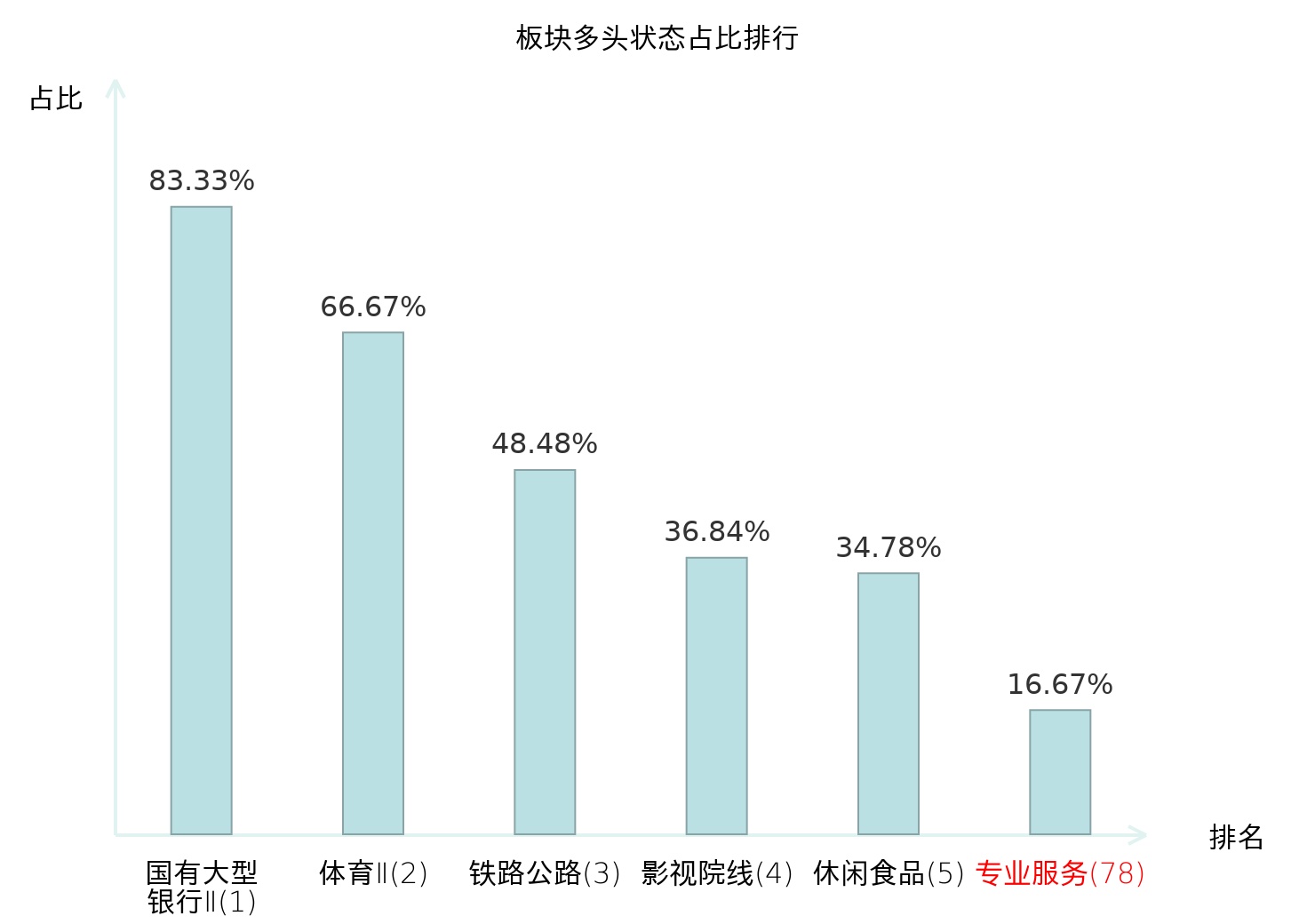 全市场所有行业板块中主力多头状态占比排名中,国有大型银行Ⅱ板块位居第一。个护用品板块名次提升最快,较昨日上升69位。