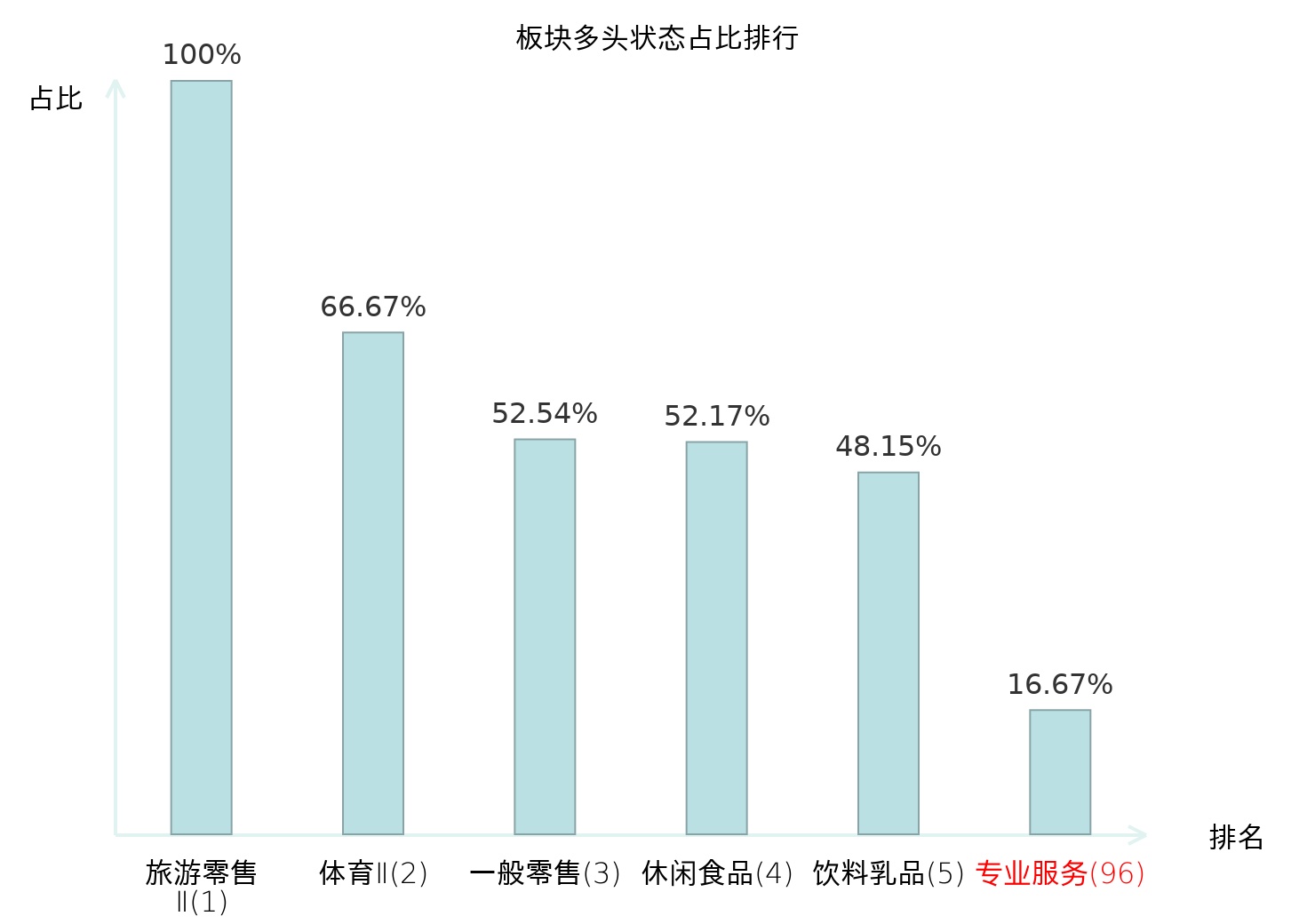 全市场所有行业板块中主力多头状态占比排名中,旅游零售Ⅱ板块位居第一。农业综合Ⅱ板块名次提升最快,较昨日上升109位。