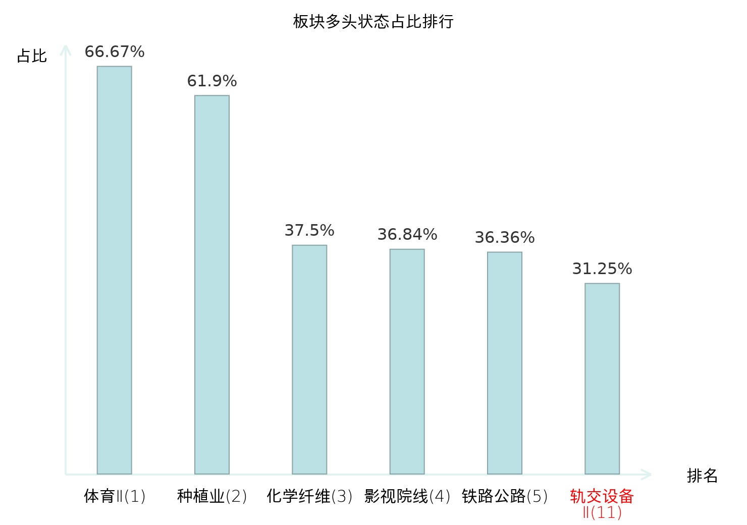 全市场所有行业板块中主力多头状态占比排名中,体育Ⅱ板块位居第一。种植业板块名次提升最快,较昨日上升65位。