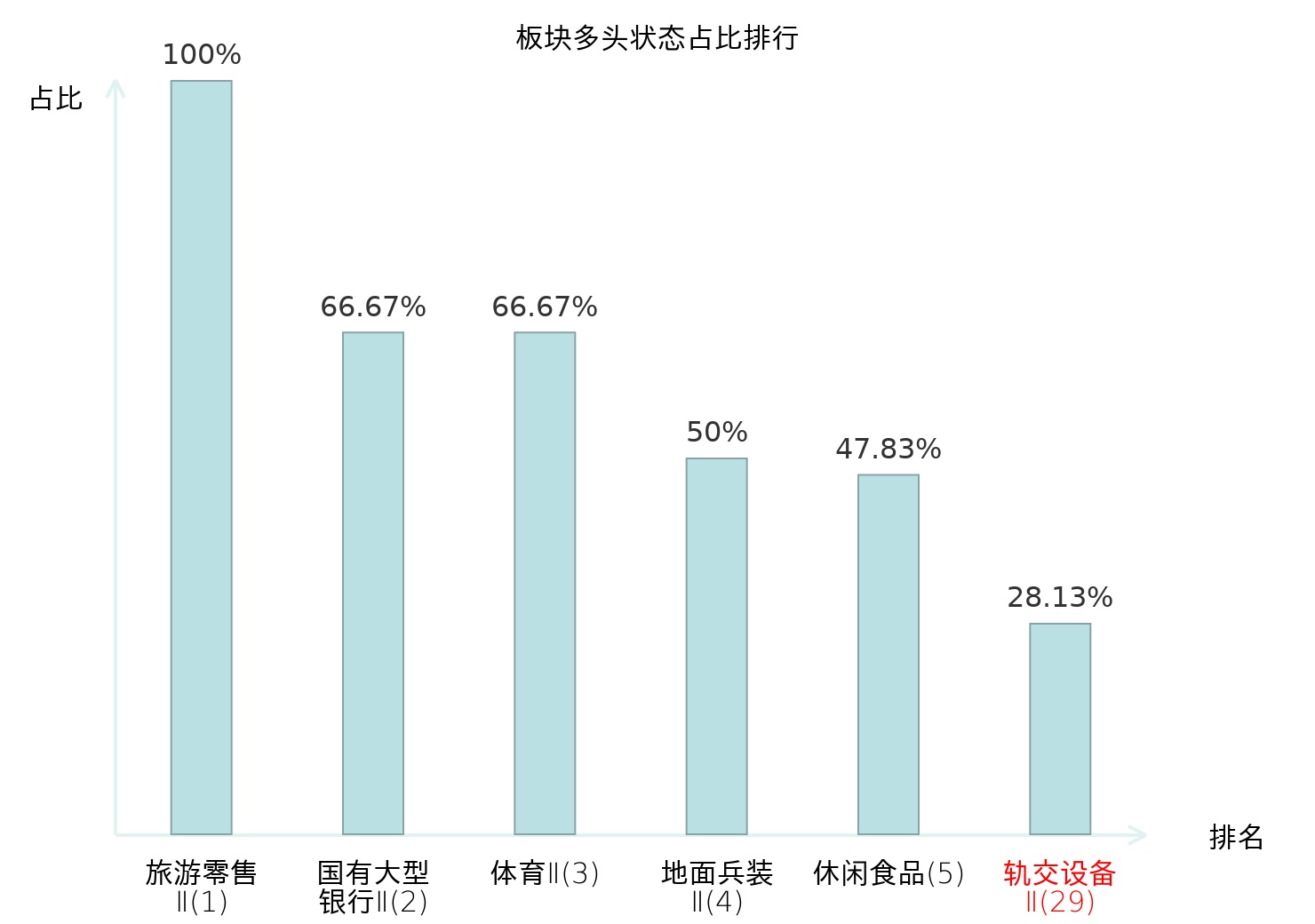 全市场所有行业板块中主力多头状态占比排名中,旅游零售Ⅱ板块位居第一。航空机场板块名次提升最快,较昨日上升80位。