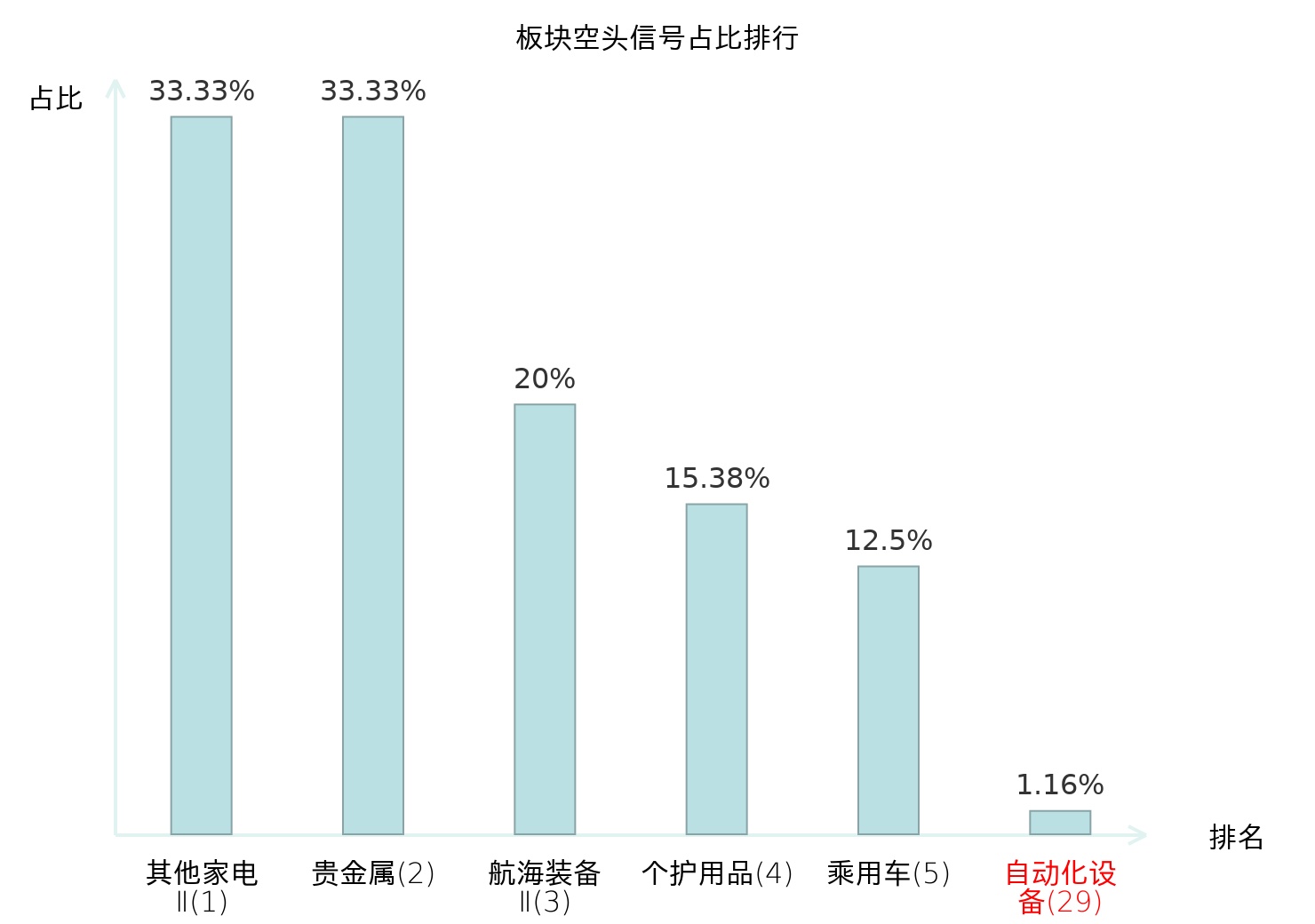 全市场所有行业板块中主力空头信号占比排名中,其他家电Ⅱ板块位居第一。工业金属板块名次提升最快,较昨日上升105位。