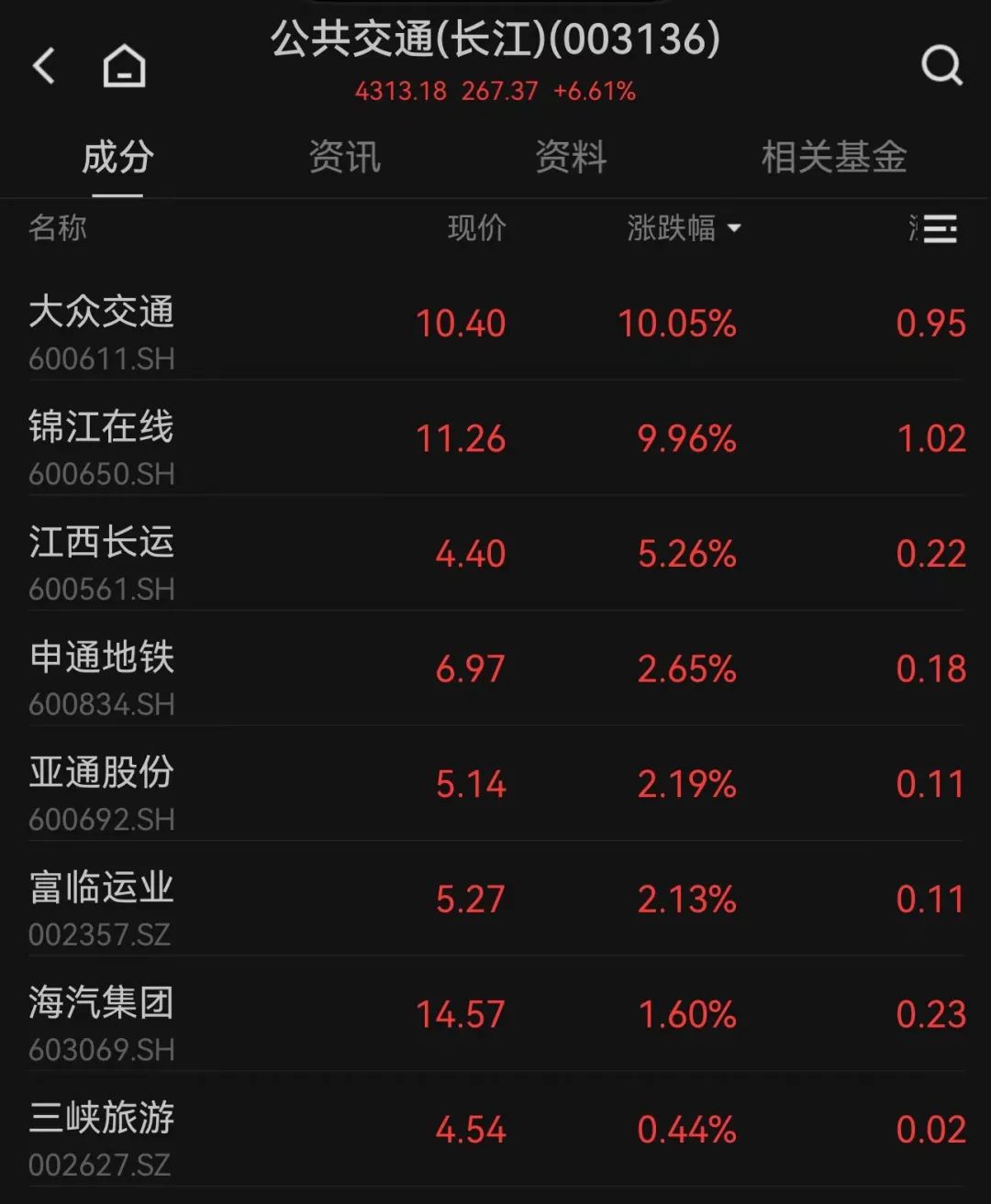 今日长江公共交通指数成份股再次全线上扬:8只股票,无一股下跌。大众交通、锦江在线强势涨停,江西长运、富临运业、申通地铁等涨幅居前。