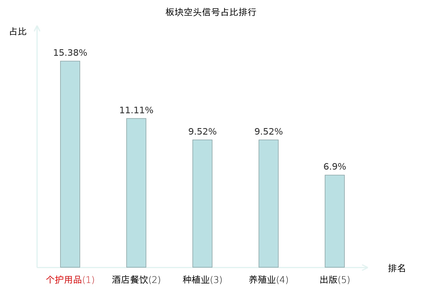 全市场所有行业板块中主力空头信号占比排名中,个护用品板块位居第一。环境治理板块名次提升最快,较昨日上升107位。
