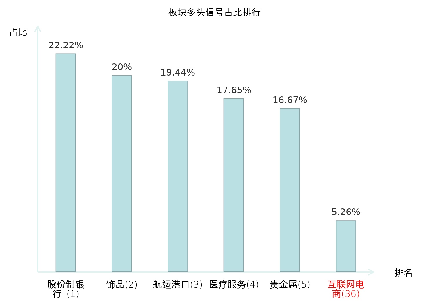 全市场所有行业板块中主力多头信号占比排名中,股份制银行Ⅱ板块位居第一。股份制银行Ⅱ板块名次提升最快,较昨日上升117位。