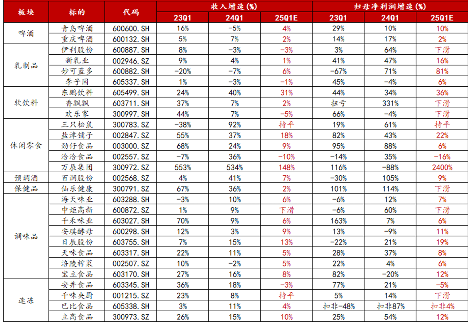 从细分子板块基本面景气度看,25Q1软饮料、零食高景气延续,啤酒、乳制品修复在途,预调酒、调味品、速冻、保健品和卤味连锁经营稳健、基本面筑底。