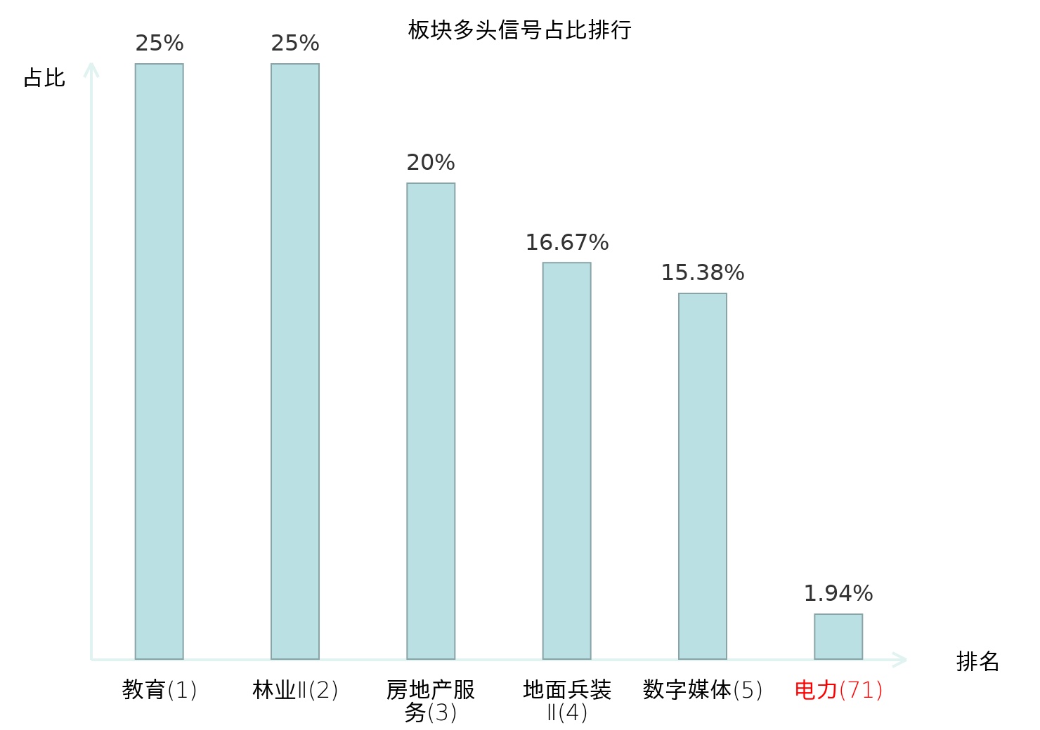 全市场所有行业板块中主力多头信号占比排名中,教育板块位居第一。林业Ⅱ板块名次提升最快,较昨日上升125位。