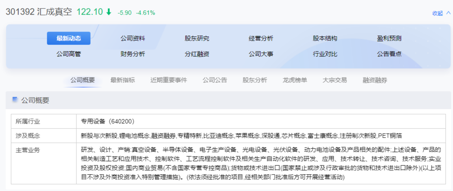 今天为大家带来的是汇成真空,我们先来了解一下这家公司是做什么的,我们通过公司概要可以清楚的看到:公司所属行业是专用设备。