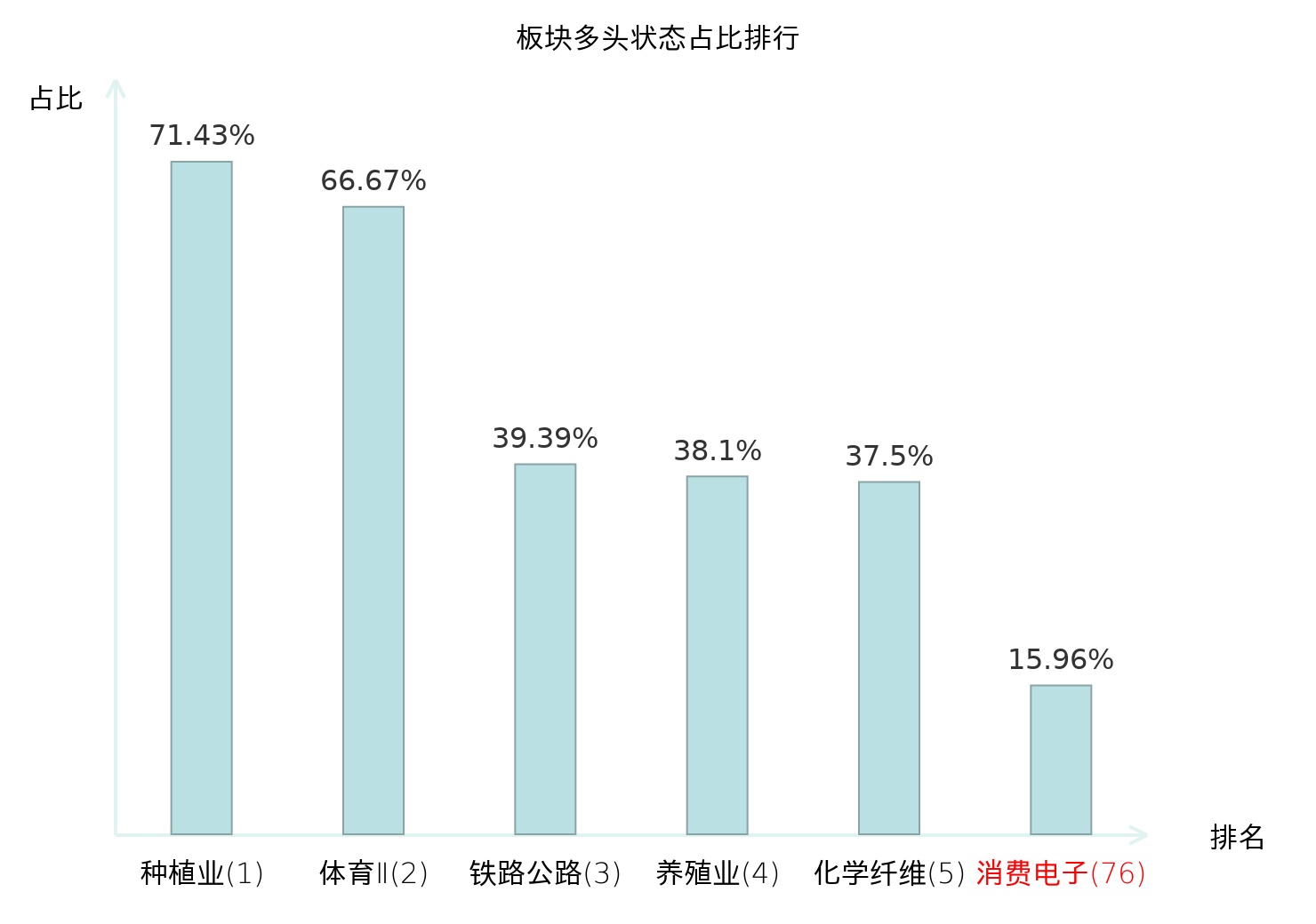 全市场所有行业板块中主力多头状态占比排名中,种植业板块位居第一。养殖业板块名次提升最快,较昨日上升99位。