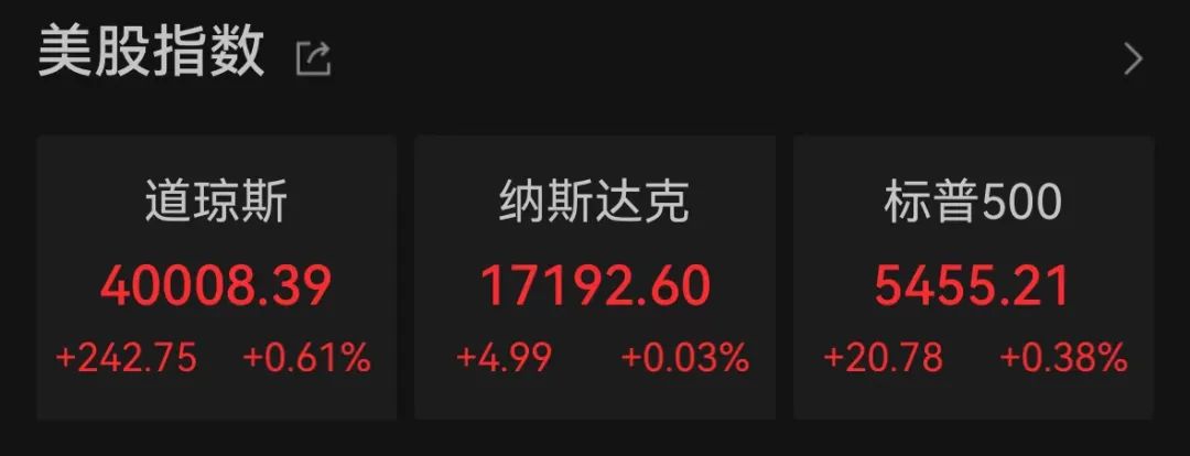 昨日晚间,美股三大股指集体走高,道指收盘涨0.61%,近五个交易日累计涨幅达到3.21%;纳指涨0.03%,标普500涨0.38%。热门科技股涨跌不一,英伟达涨1.67%,微软涨0.69%,苹果微涨0.2%,谷歌跌超2%。