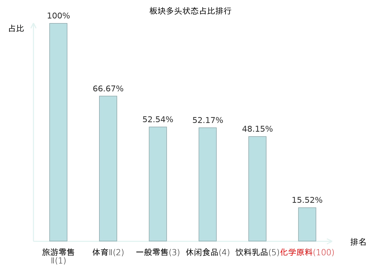全市场所有行业板块中主力多头状态占比排名中,旅游零售Ⅱ板块位居第一。农业综合Ⅱ板块名次提升最快,较昨日上升109位。