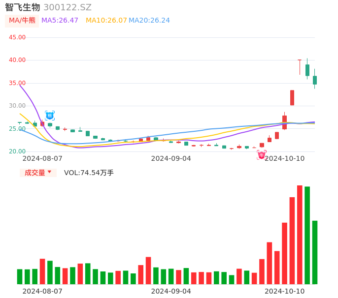 10月10日,智飞生物收报34.73,股价涨幅-5.08%,成交金额26.37亿,换手率5.27%。