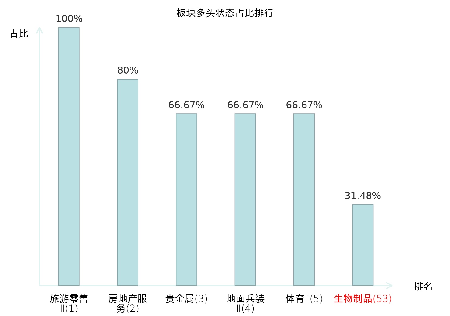 全市场所有行业板块中主力多头状态占比排名中,旅游零售Ⅱ板块位居第一。个护用品板块名次提升最快,较昨日上升70位。