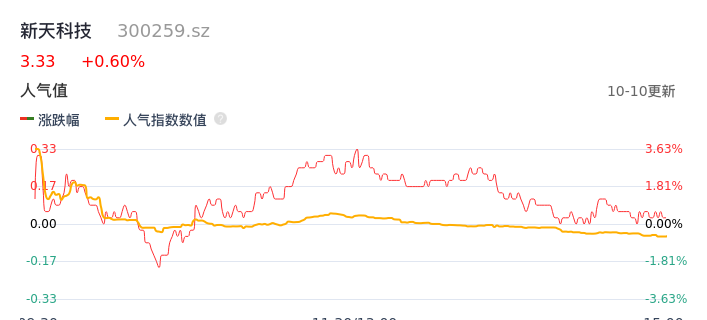 10月10日,新天科技收报3.33,股价涨幅0.60%,成交金额8357.60万,换手率2.13%。