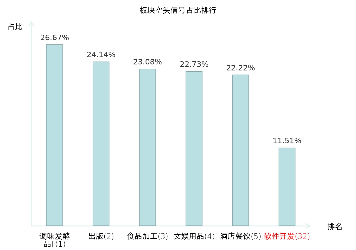 全市场所有行业板块中主力空头信号占比排名中,调味发酵品Ⅱ板块位居第一。中药Ⅱ板块名次提升最快,较昨日上升110位。