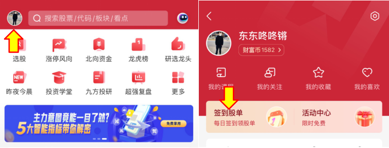 交易日9:00签到股单查看方式:点击App首页左上方头像-进入个人中心页“签到股单”查看