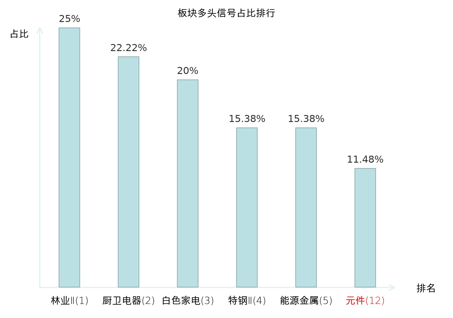 全市场所有行业板块中主力多头信号占比排名中,林业Ⅱ板块位居第一。林业Ⅱ板块名次提升最快,较昨日上升124位。