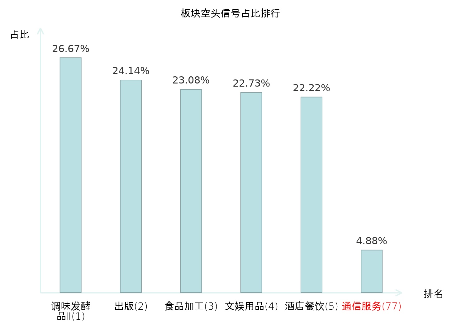 全市场所有行业板块中主力空头信号占比排名中,调味发酵品Ⅱ板块位居第一。中药Ⅱ板块名次提升最快,较昨日上升110位。
