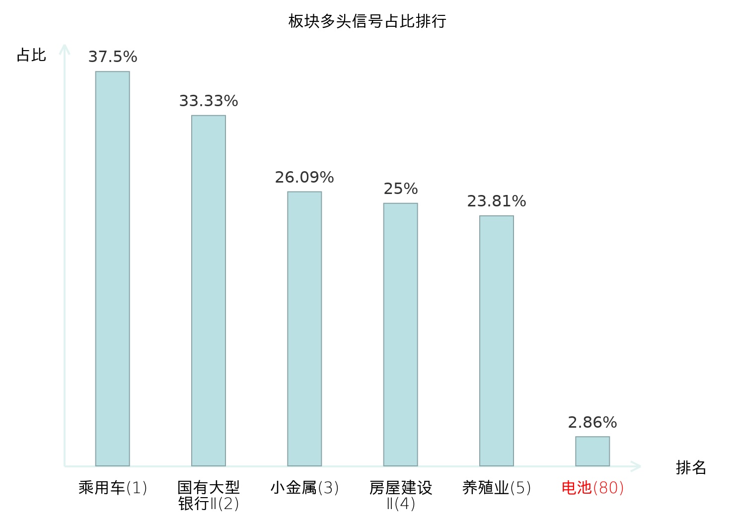 全市场所有行业板块中主力多头信号占比排名中,乘用车板块位居第一。国有大型银行Ⅱ板块名次提升最快,较昨日上升124位。