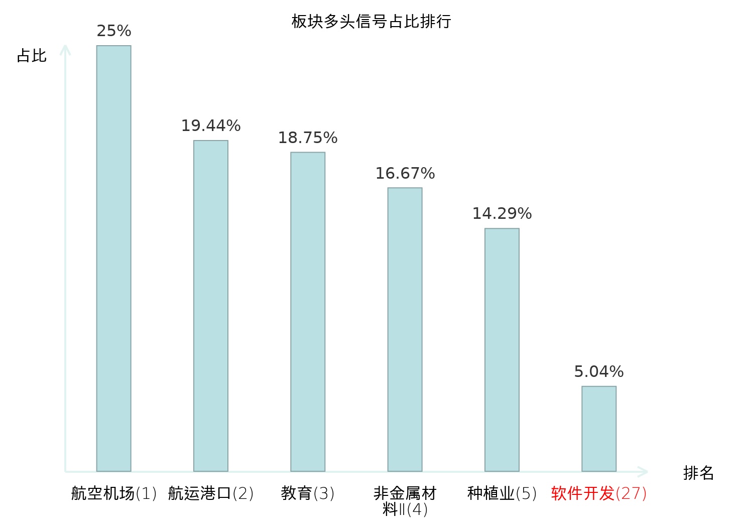 全市场所有行业板块中主力多头信号占比排名中,航空机场板块位居第一。航空机场板块名次提升最快,较昨日上升111位。