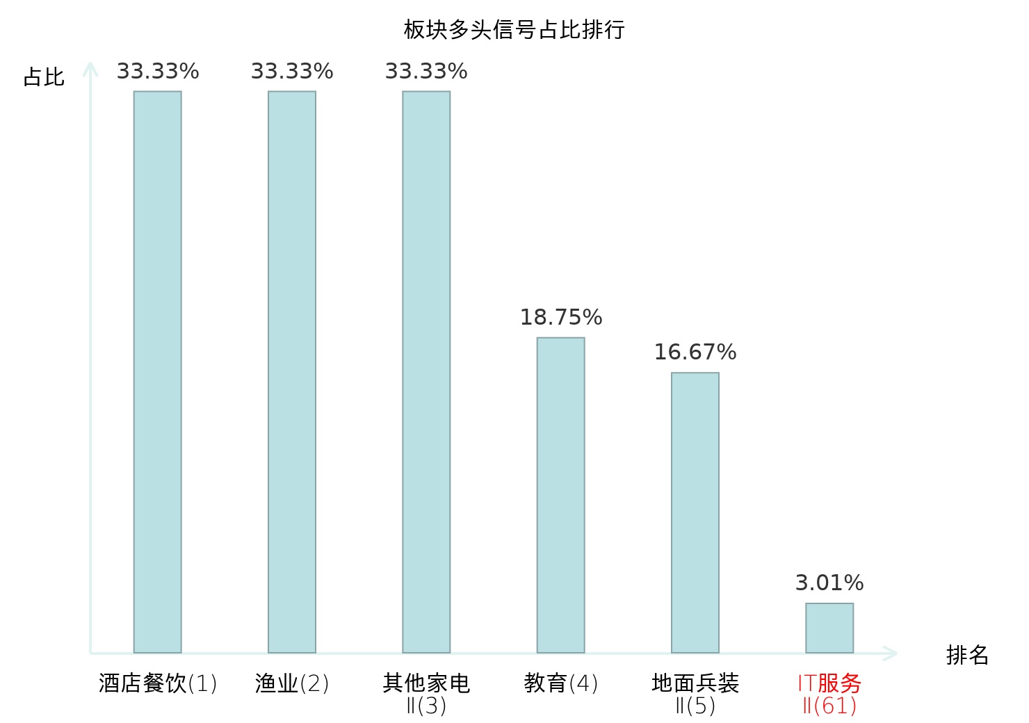 全市场所有行业板块中主力多头信号占比排名中,酒店餐饮板块位居第一。其他家电Ⅱ板块名次提升最快,较昨日上升126位。