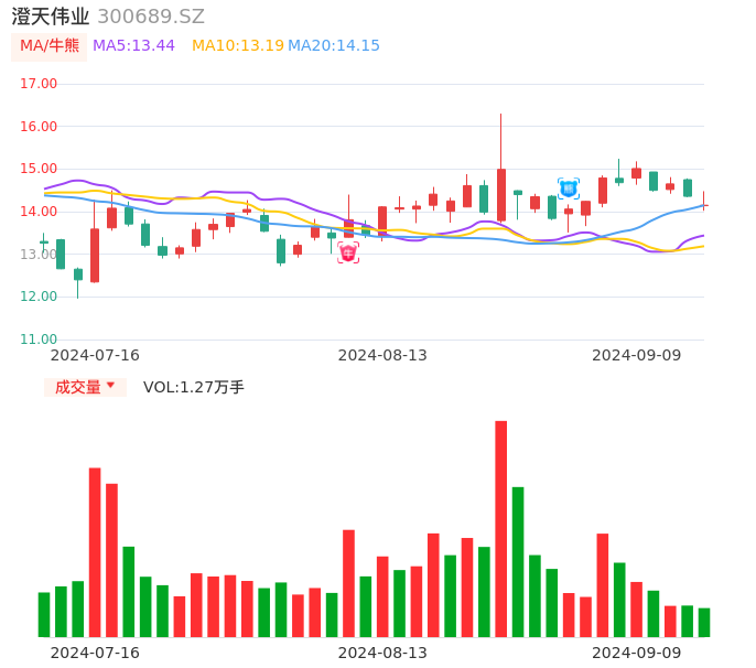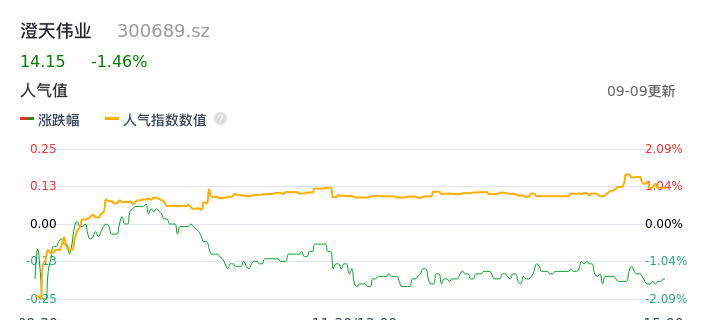 09月09日,澄天伟业收报14.15,股价涨幅-1.46%,成交金额1798.22万,换手率1.25%。