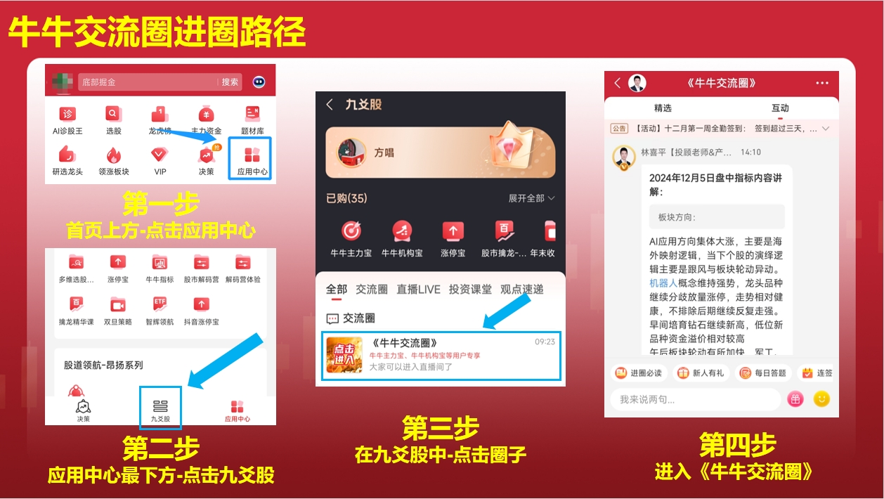 如果您拥有【牛牛主力宝】、【牛牛机构宝】、【AI顶底】的权限,可以按照如图的方式进入圈子: