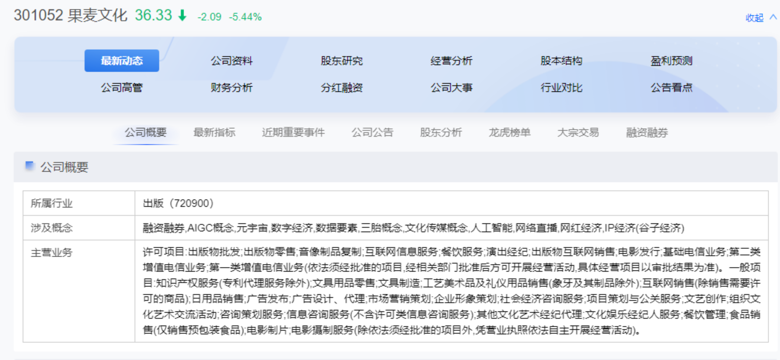 今天为大家带来的是果麦文化,我们先来了解一下这家公司是做什么的,我们通过公司概要可以清楚的看到:公司所属行业是出版。