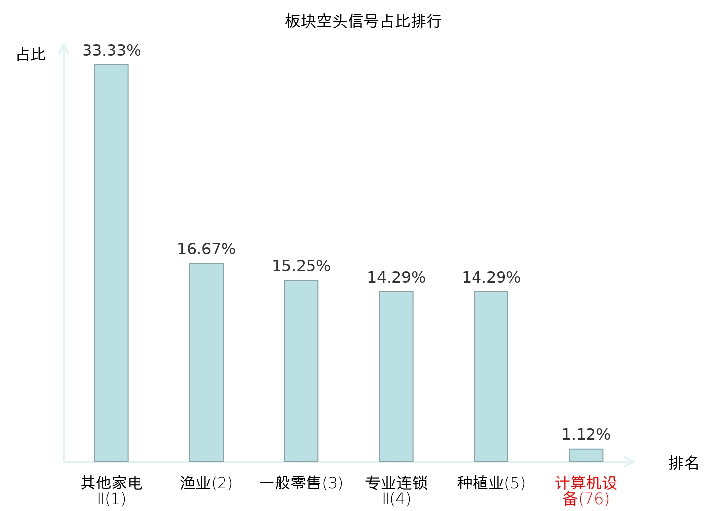 全市场所有行业板块中主力空头信号占比排名中,其他家电Ⅱ板块位居第一。造纸板块名次提升最快,较昨日上升115位。
