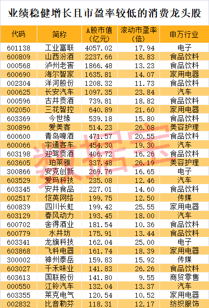 大消费领域涉及行业广泛,数据宝以食品饮料、家用电器、商贸零售、纺织服饰、消费电子、游戏、社会服务、美容护理、汽车等与日常消费、可选消费关系密切的行业为基础,从中筛选出业绩稳健增长,且市盈率较低的超跌龙头股,具体条件如下: