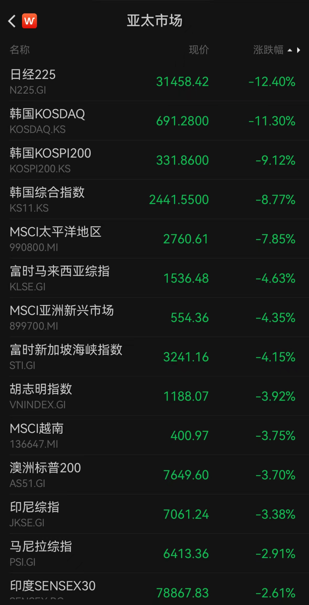富时新加坡海峡指数盘中跌超5%,越南VN指数、富时马来西亚综指、印尼综指盘中跌超4%,印度SENSEX30指数盘中跌超3%,澳洲标普200指数盘中跌超3.8%。