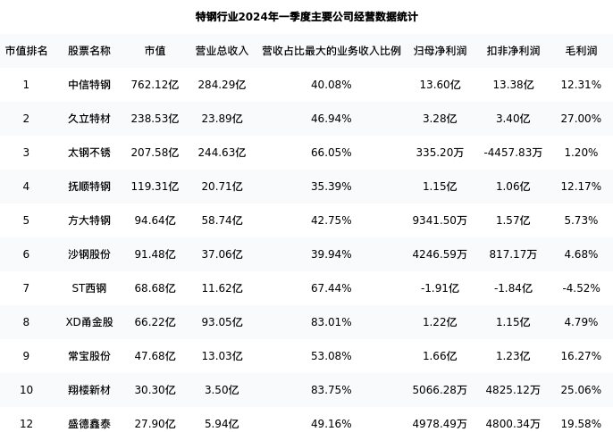 盛德鑫泰最新报告期数据为一季度,下表汇总了特钢行业内市值靠前的公司一季度主要经营数据