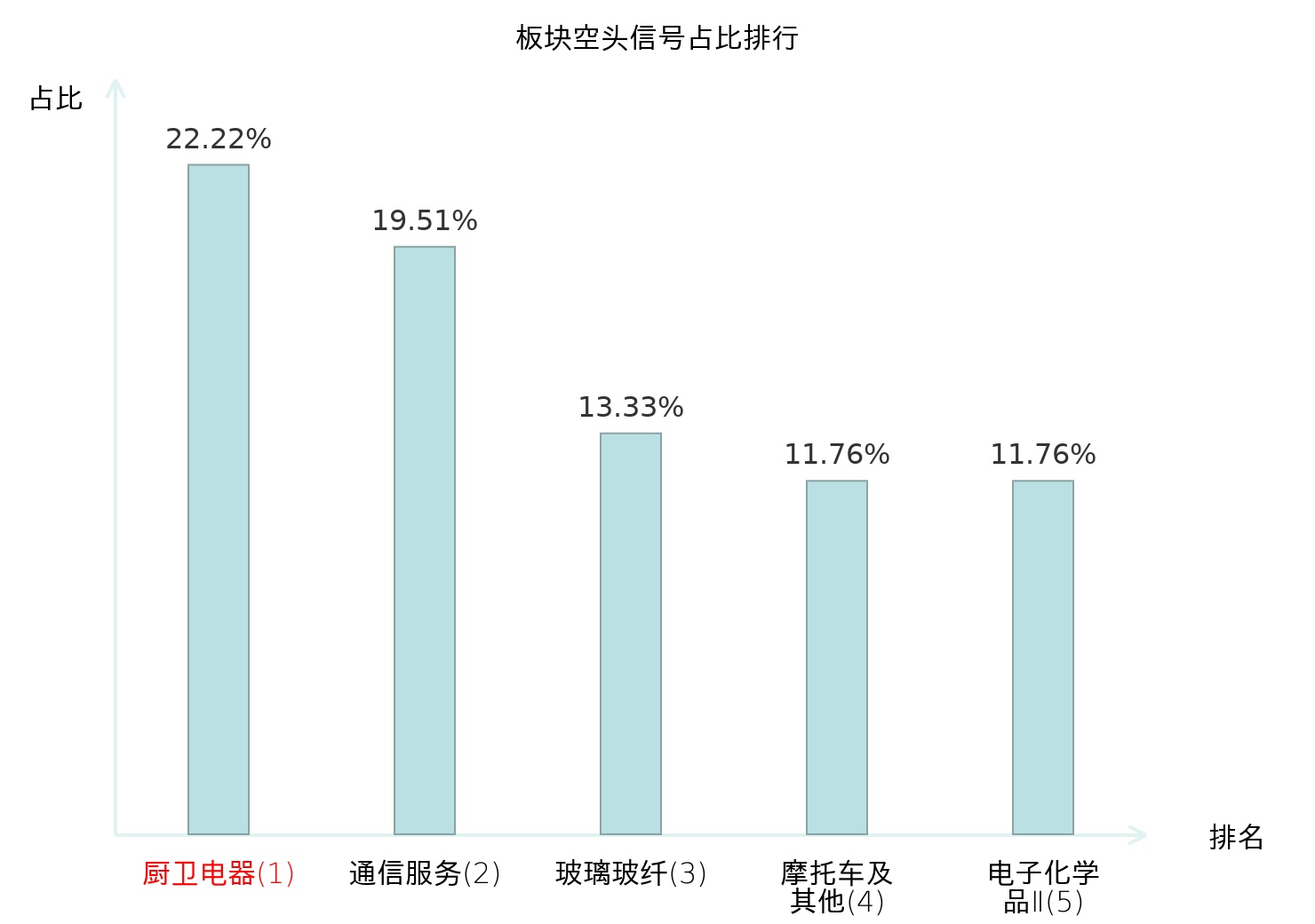 全市场所有行业板块中主力空头信号占比排名中,厨卫电器板块位居第一。家电零部件Ⅱ板块名次提升最快,较昨日上升121位。