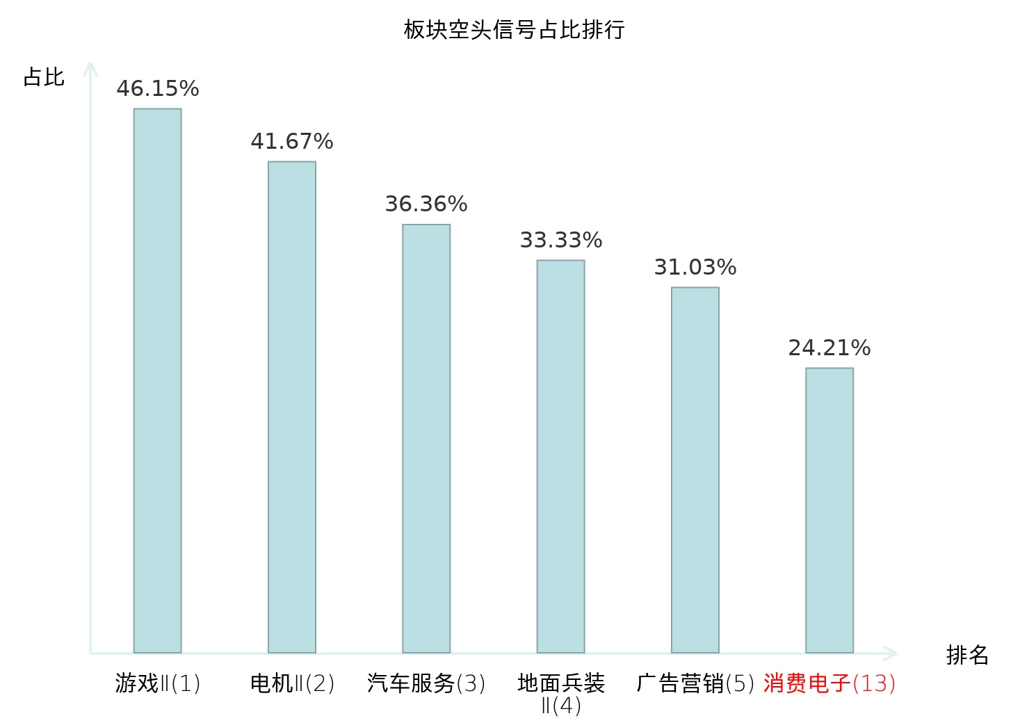 全市场所有行业板块中主力空头信号占比排名中,游戏Ⅱ板块位居第一。光学光电子板块名次提升最快,较昨日上升103位。