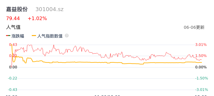 06月06日,嘉益股份收报79.44,股价涨幅1.02%,成交金额7018.23万元,换手率3.32%。