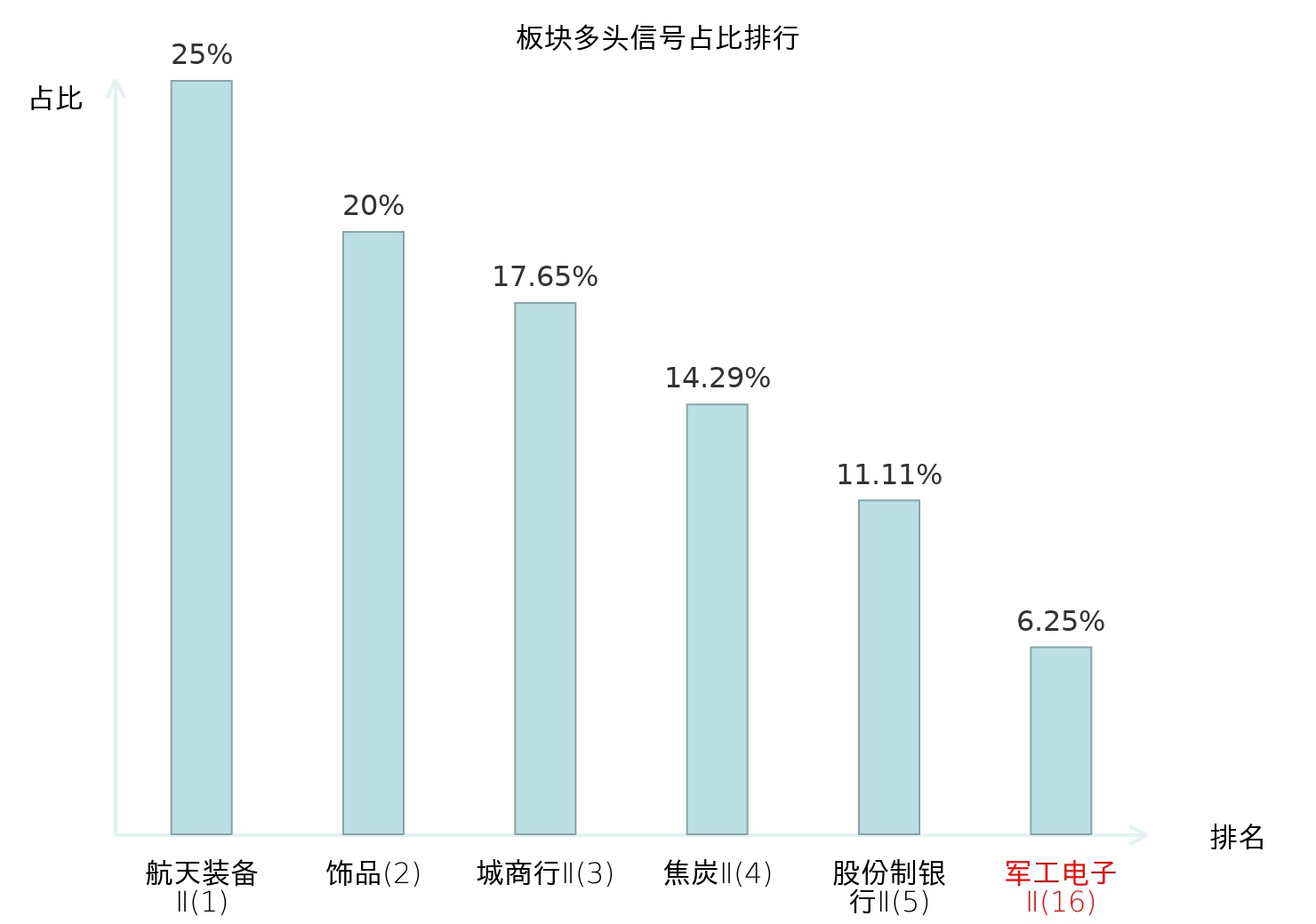 全市场所有行业板块中主力多头信号占比排名中,航天装备Ⅱ板块位居第一。航天装备Ⅱ板块名次提升最快,较昨日上升122位。