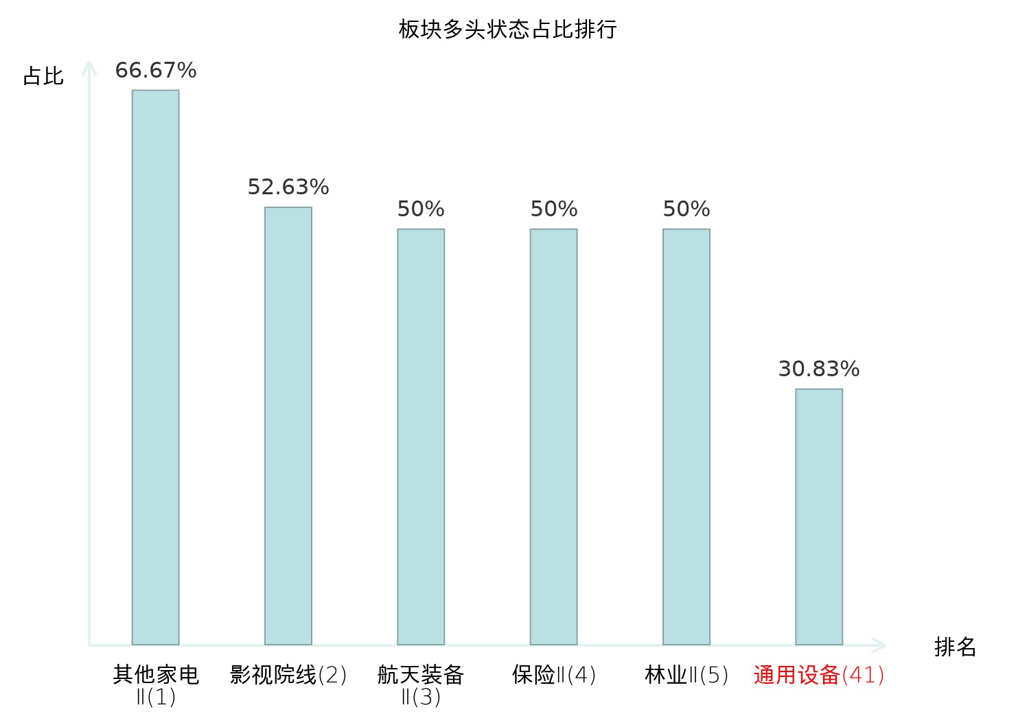 全市场所有行业板块中主力多头状态占比排名中,其他家电Ⅱ板块位居第一。林业Ⅱ板块名次提升最快,较昨日上升76位。