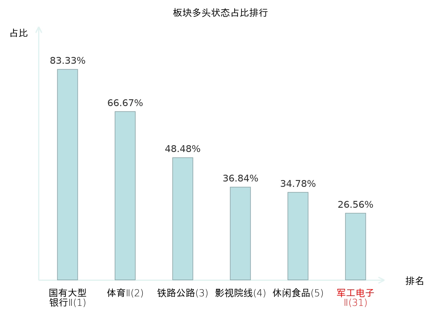 全市场所有行业板块中主力多头状态占比排名中,国有大型银行Ⅱ板块位居第一。个护用品板块名次提升最快,较昨日上升69位。