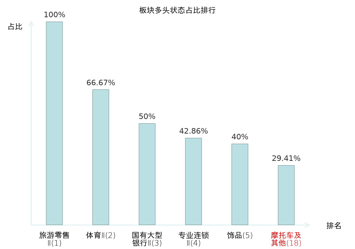 全市场所有行业板块中主力多头状态占比排名中,旅游零售Ⅱ板块位居第一。半导体板块名次提升最快,较昨日上升78位。