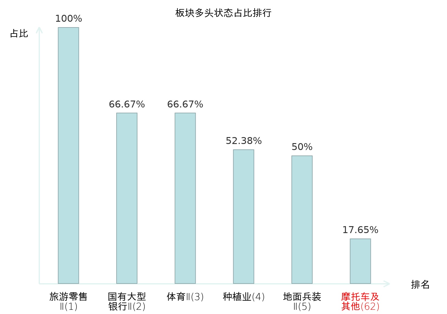 全市场所有行业板块中主力多头状态占比排名中,旅游零售Ⅱ板块位居第一。股份制银行Ⅱ板块名次提升最快,较昨日上升54位。