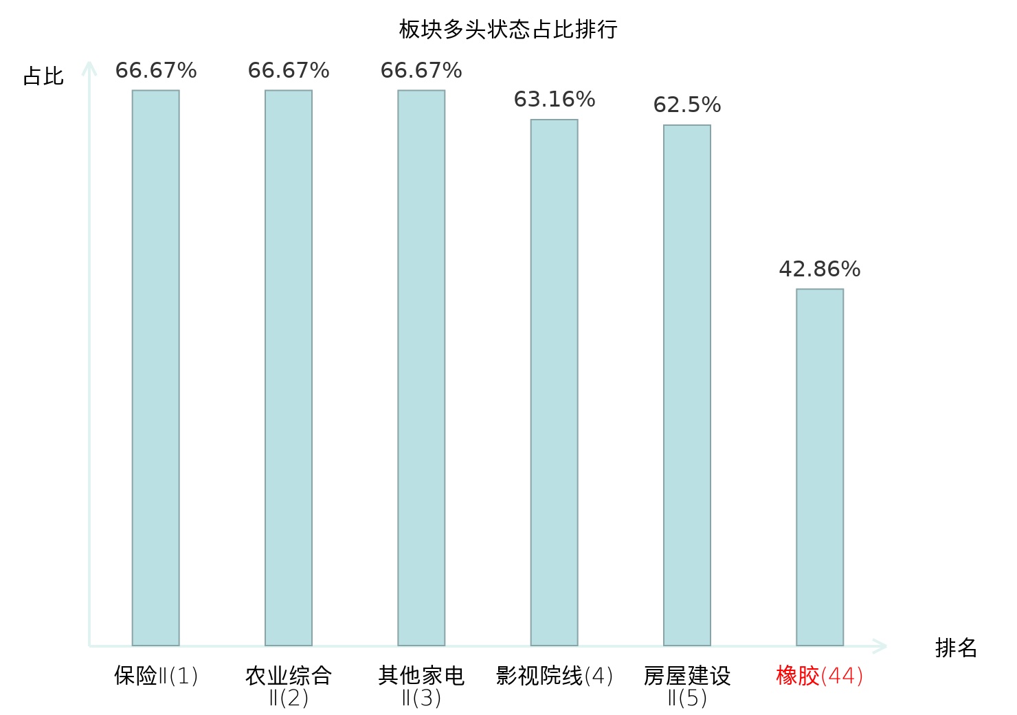 全市场所有行业板块中主力多头状态占比排名中,保险Ⅱ板块位居第一。渔业板块名次提升最快,较昨日上升103位。