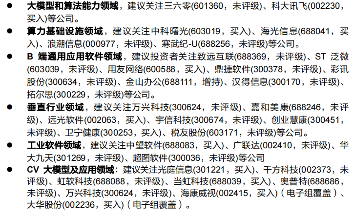 通过昨天商汤大模型的展现,机构认为商汤大模型API的开放,未来有望推动大模型在各个行业场景的加速落地,大模型能力即将赋能千行百业。鉴于AI大模型正迎来快速发展的窗口期,大模型在行业的应用落地正在加速,相关的算法、算力基础设施、下游B端通用应用软件、垂直行业领域和CV领域都有望迎来加速增长。分类梳理相关对标,主要参考如下: