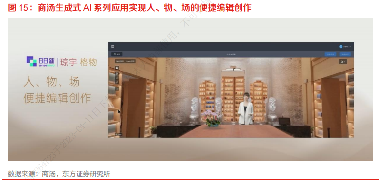 从商汤自研生成式AI系列应用来看,商汤将大模型赋能给旗下的生成平台工具,发布了自研的生成式AI系列应用“秒画”、“如影”、“琼宇”、“格物”,覆盖了图片、数字人、空间场景和物体的生成,能够帮助用户快速完成创意视频制作。通过四大生成式AI应用的相互叠加,可以实现人、物、场的便捷编辑与创作,用户能够自由且方便地对视频中的场景、光影、物件等效果进行快速调整与变化,达成“还原真实,万物重生”的效果。