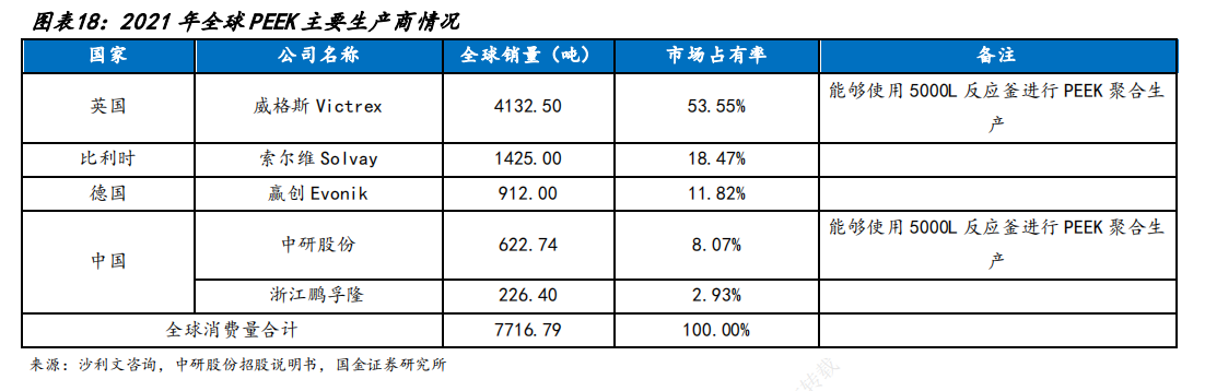 市场竞争格局来看,全球PEEK材料生产厂商呈现“一超多强”的局面,龙一威格斯占六成市场份额。国产头部公司中研股份、鹏孚隆2021年销量分别为623、226吨,市占率分别为8.1%、2.9%,其中中研股份位居全球市占率第四位。