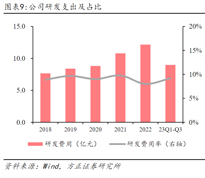 公司研发维持高投入,技术沉淀增强公司硬实力,2018-2022年公司研发投入持续提升,2022年研发费用高达12.16亿元。研发费用率较为平稳,维持在9%左右,并在2023一季度到三季度进一步提升至9.18%。高度重视研发投入,通过持续研发保持领先的精益制造能力。2022年研发人员数量达到8339人,建立了完善的研发平台以及强大的技术团队。高研发投入的背后是不断改善的研发条件和技术设备,以及高端技术人才的不断引入。